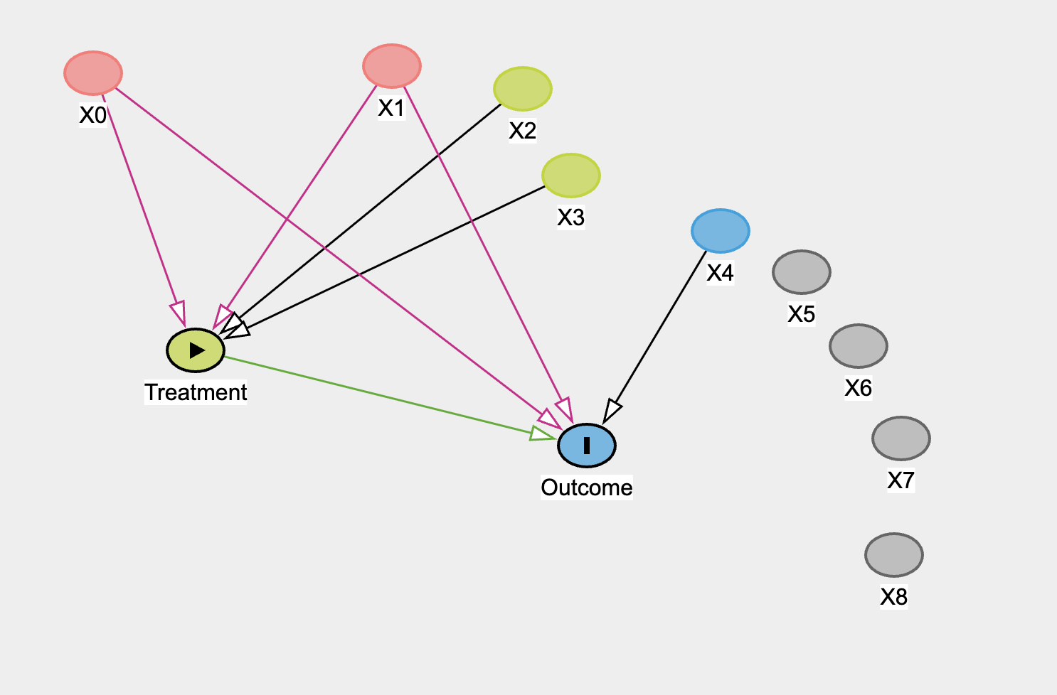 Each simulated observation has a treatment \(T\), an outcome \(Y\), and a set of covariates \(X\) with distinct causal roles. Two covariates influence both the treatment and the outcome—these are the confounders. Two others affect only the treatment and serve as valid instruments. A final covariate affects only the outcome. The treatment and outcome errors are drawn from a correlated bivariate normal distribution, introducing endogeneity through their correlation parameter \(\rho\). When \(\rho\) is low the treatment can be considered exogenous and standard regression should recover the correct effect; while naive estimates will be biased when \(\rho\) is high.